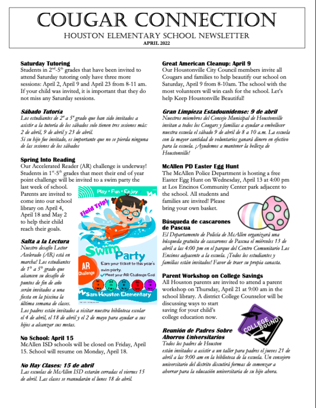 Read the Cougar Connection: Houston Elementary School Newsletter for April 2022!
