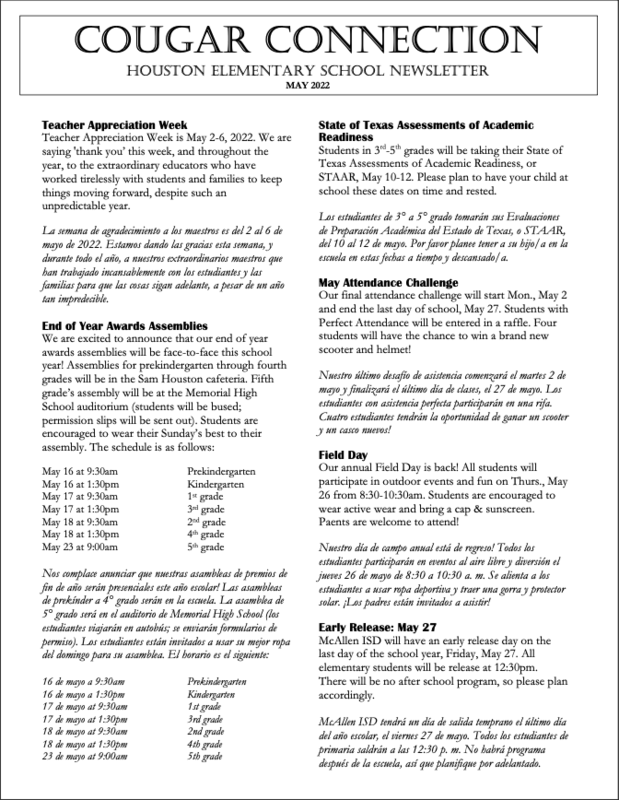 Read the Cougar Connection: Houston Elementary School Newsletter for May 2022!
