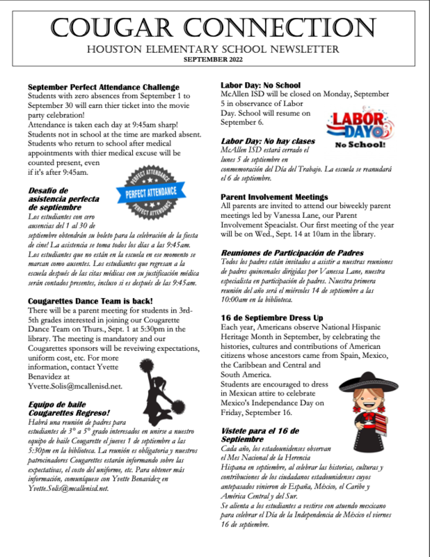 Read the Cougar Connection: Houston Elementary School Newsletter for September 2022!