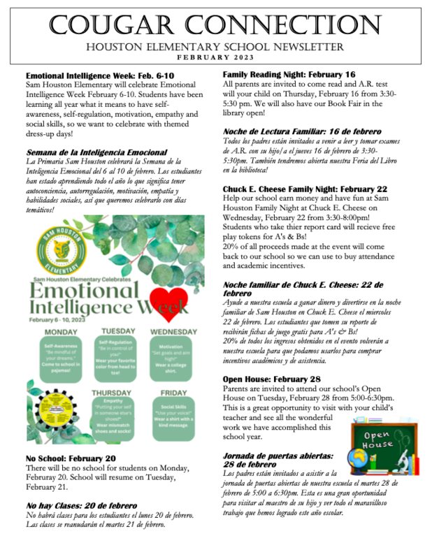 Read the Cougar Connection: Houston Elementary School Newsletter for February 2023!